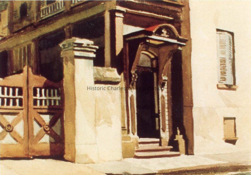 a: Postcard featuring Edward Hopper's 1929 watercolor painting "Charleston Doorway," depicting the doorway of 56 Society Street. "Victorian front later removed [after] 1950s" (note on back).
