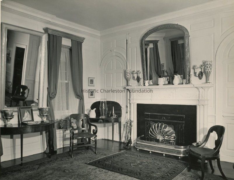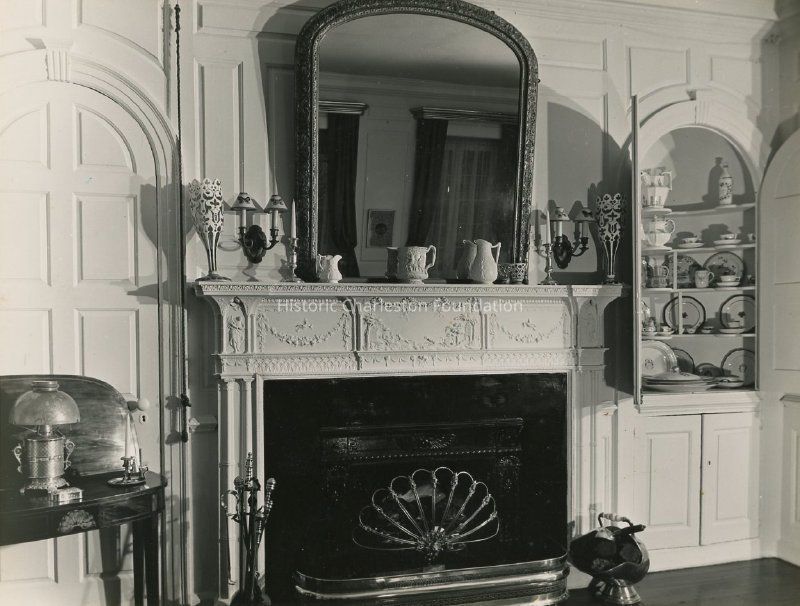 Two B&W photographs of the 39 Church Street (George Eveleigh House) drawing room. Photo A is featured in Festival of Homes tour booklets from 1949-1957. Photo B features the fireplace and Adam mantel that was rescued from the Nathaniel Heyward House.Collection