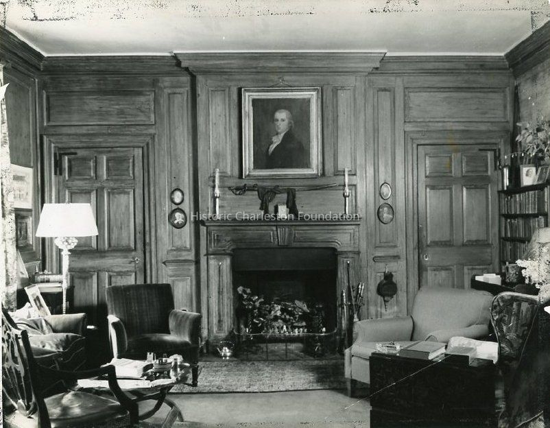 B&W photograph of a drawing room in the Othniel Beale House (99-101 East Bay Street). Features the fireplace and interior woodwork.