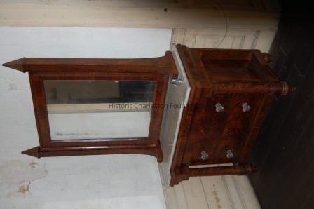 having rectangular marble top with cut-out front, over single shaped long dressing drawer which opens to reveal 9 divided compartments, over 2 long graduated drawers with glass knob handles, flanked by circular columnar supports, on bun feet; having attached mirror in square molded frame flanked by shaped supports with pyramid-shaped finials.Collection