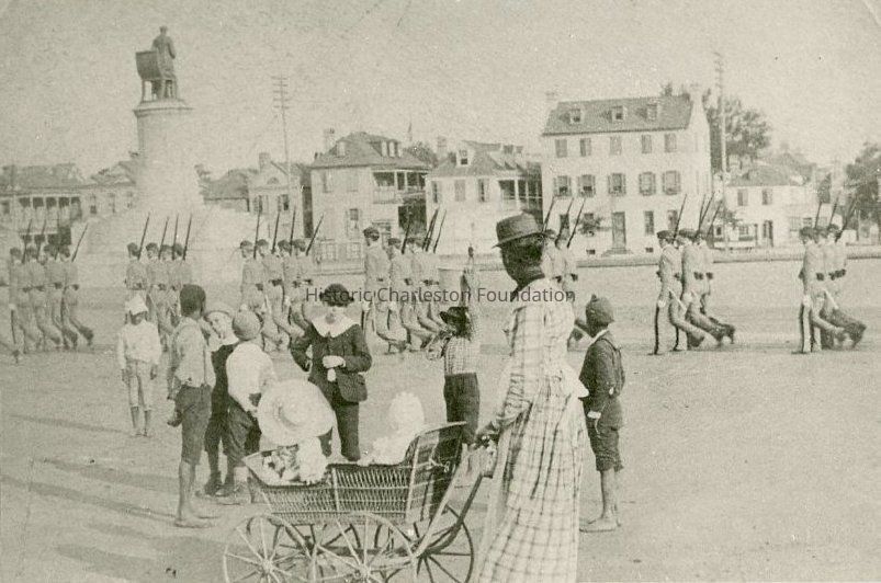 Reprint of a photograph featuring military cadets marching on the Old Citadel, viewed looking south to Calhoun Street. Children and a woman pushing a baby carriage are in the foreground. The back of the first original Calhoun Monument in mid-ground at left. A row of houses on Calhoun Street in background (possibly 135-177 Calhoun).