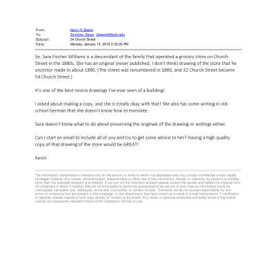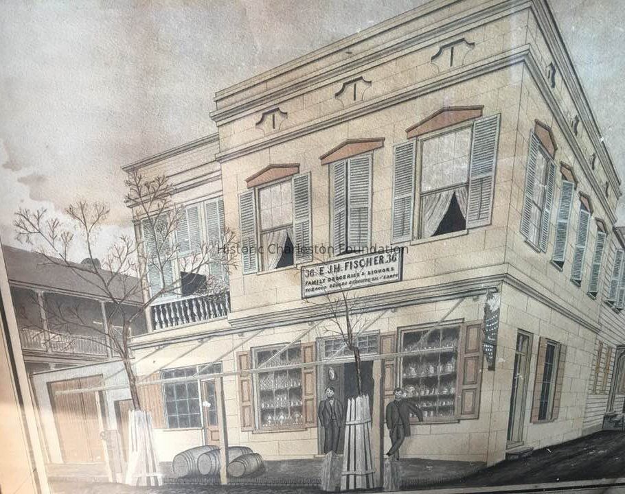 Drawing (scan) of the E.J.H. Fischer Family Groceries and Liquor store, located at the northeast corner of Church Street and Stoll's Alley (54 Church Street).