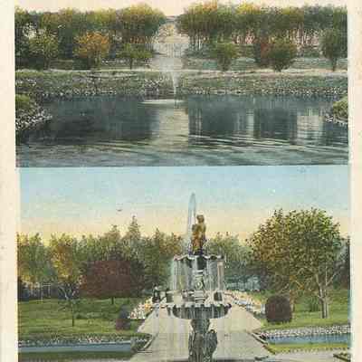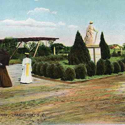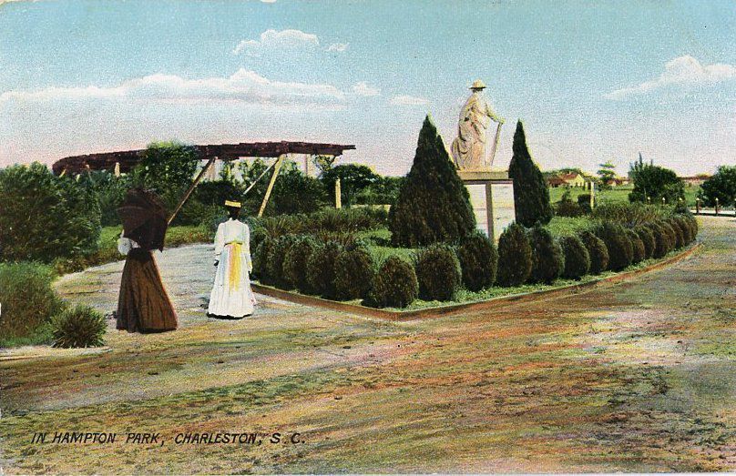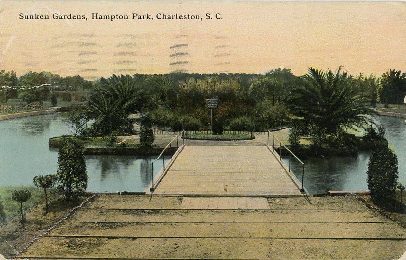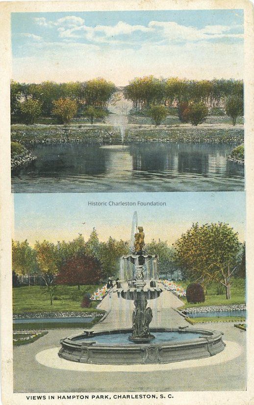 e: Titled "Views in Hampton Park." Early 20th century. View of a pond (top) and a fountain (bottom). Captioned "King Street car direct to the grounds. In the days of long ago, this Park was part of the old Washington Race Track, and under its great oaks, near the river, many famous duels were fought. In 1901-02 it was used for the South Carolina Inter-State and West Indian Exposition, but only here and there can a trace of that time be seen. It is beautiful with its sunken garden; and in the Spring it abounds with a profusion of various kinds of flowers."