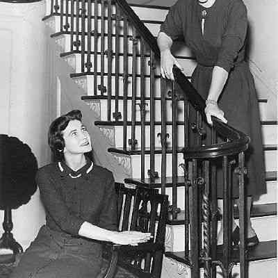 b: Festival hostesses Chance Stevens Ravenel (seated) and Elizabeth Williams (standing) by the staircase in an unidentified house.Collection