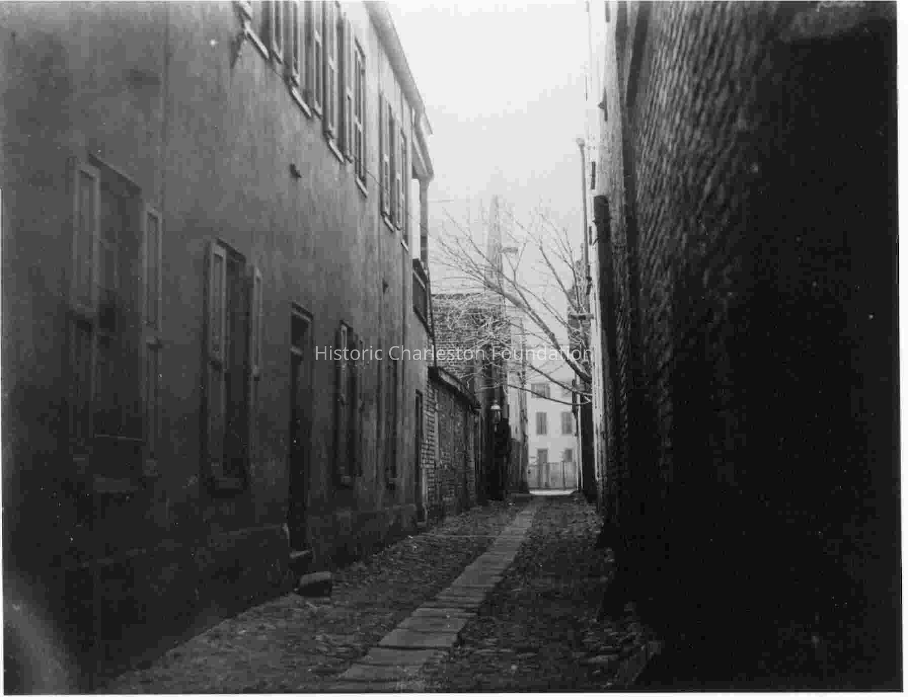 East Bay Street looking down Lodge Alley to State Street. St. Philip's Church steeple in distance.Collection