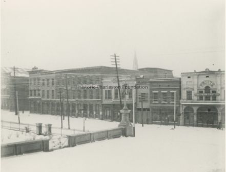 Photo is identified as East Bay Street, below Market Street, in the snow. Shops include Southern Fruit Co. (217 East Bay) and Geo. W. Steffens Sons. This shot is taken at almost the same location as 2004.021.102 and is at the 200+ block of East Bay Street (west side of street).Collection