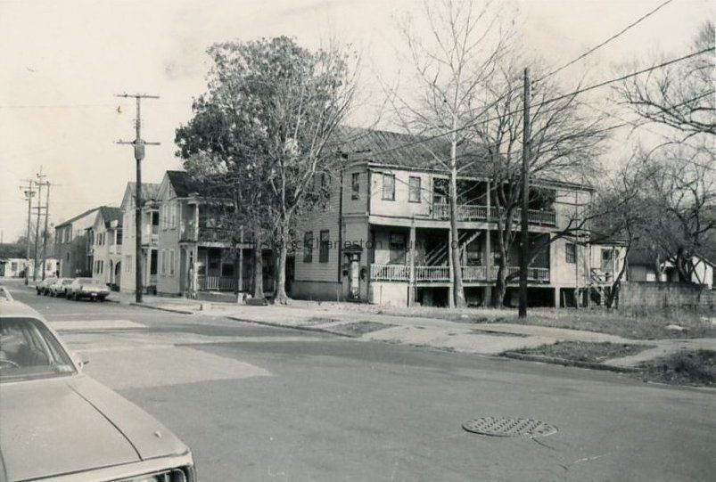 B&W photograph of a view looking east on Judith Street from 9 Judith (before rehabilitation), showing its north (front) and west (piazzas) elevations. Also shows (left to right) 3 Judith, 5 Judith, and 7 Judith.Collection