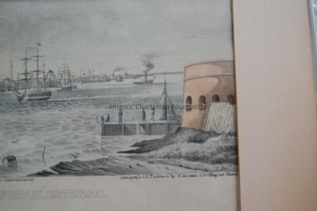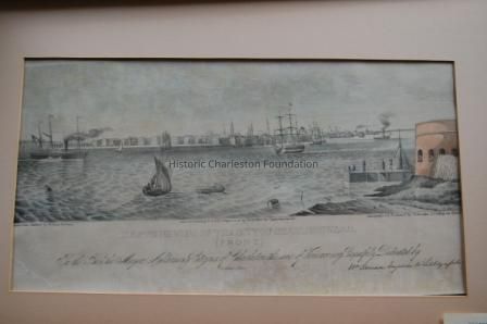 Lithograph, hand-colored. Entitled, "Eastern View of the City of Charleston S.C." Marine scape or maritime view of Charleston Harbor from Castle Pinckney with White Point Garden and the Battery at the left.
