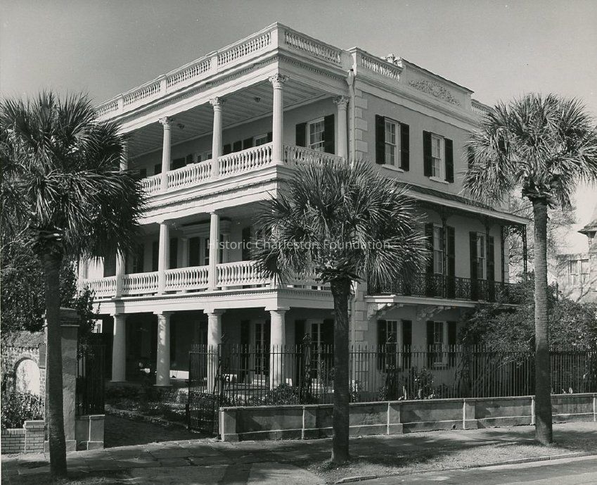 B&W photograph of the Edmonston-Alston House (21 East Battery), showing the southeast corner of the building. Features the front of the building and piazzas, and the wrought iron fence that runs along the front of the property. Three palm trees are in the foreground.Collection