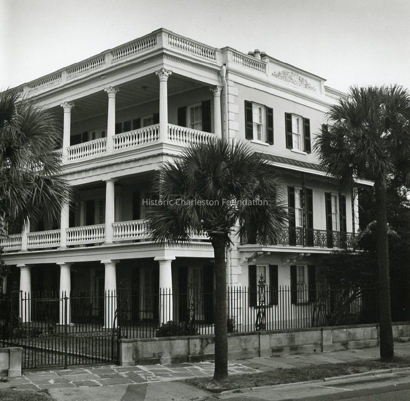 B&W photograph of the Edmonston-Alston House (21 East Battery), showing the southeast corner of the building. Features the front of the building and piazzas, and the wrought iron fence that runs along the front of the property. Three palm trees are in the foreground.Collection