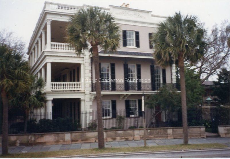 b: Southeast corner of the building showing the front of the building and piazzas, and the wrought iron fence that runs along the front of the property. Three palm trees in the foreground.