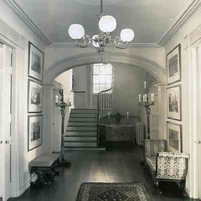 b: First floor entry hall viewed (west) through the arched opening to the stairway.