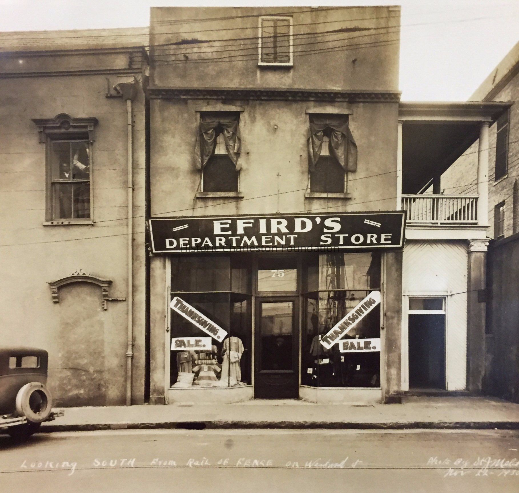 B&W photograph (scan) of Efird's Department Store (75 Wentworth Street), street (front) elevation. Signage for Thanksgiving Sale in both windows. Photo is captioned: "Looking south from rail of fence on Wentworth St. Photo by St. J Melcher, Nov. 22, 1930."