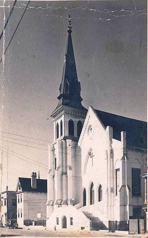 B&W photograph (scan) of Emanuel A.M.E. Church, south elevation, southeast corner. Its neighbors to the west, 114 Calhoun and 116 Calhoun, are also in view, both of which were demolished.