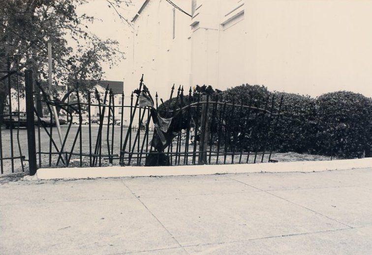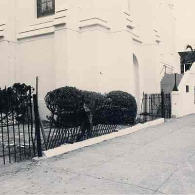 f-g: View of the iron fence damage. Photo F also shows the lower portion of the southwest corner of the Church.