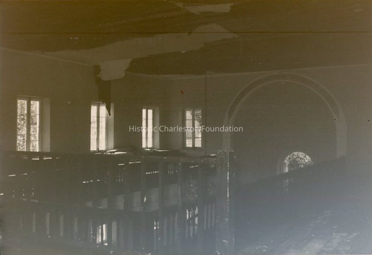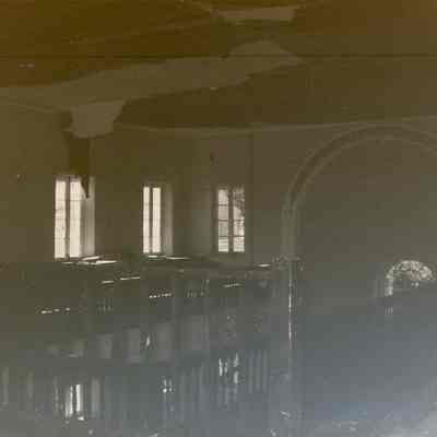 l: View of the interior of the Church from the balcony showing the water damage done to the ceiling. (Poor exposure, very dark.)