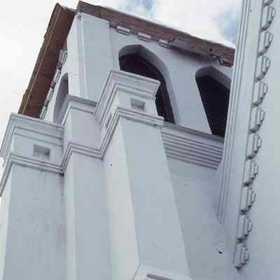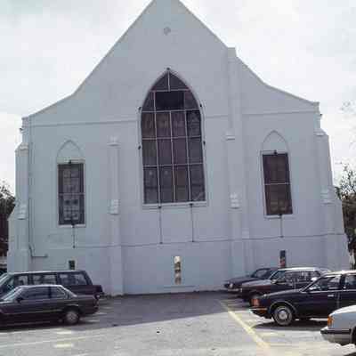 Three color slides of Emanuel A.M.E. Church (108-110 Calhoun Street) taken soon after Hurricane Hugo. Slides dated November 3, 1989. Street (front) elevation.