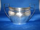 Sugar Bowl, attributed to London Maker Alexander Field, Hallmarks: Lion Passant, Leopards Head crowned ,F, Monarch Head Profile facing Right. Oval silver sugar bowl with two strap handles, engraved with Daggar Crest in center of wreath on one side. Makers Mark in rectangular cartouche rubbed, but attributed to Alexander Field.