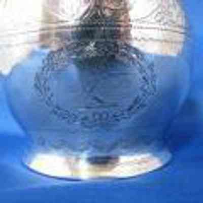 Stamped: Lion Passant, crowned leopard's head,date mark, monarch facing rightEnglish Creamer C. 1801-2, Silver Sugar Bowl, attributed to London Maker Alexander Field, Hallmarks: Lion Passant, Leopards Head crowned , F, Monarch Head Profile facing Right. Oval silver sugar bowl with two strap handles, engraved with Daggar Crest in center of wreath in front of bowl.. Makers Mark in rectangular cartouche rubbed, but attributed to Alexander Field.