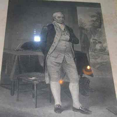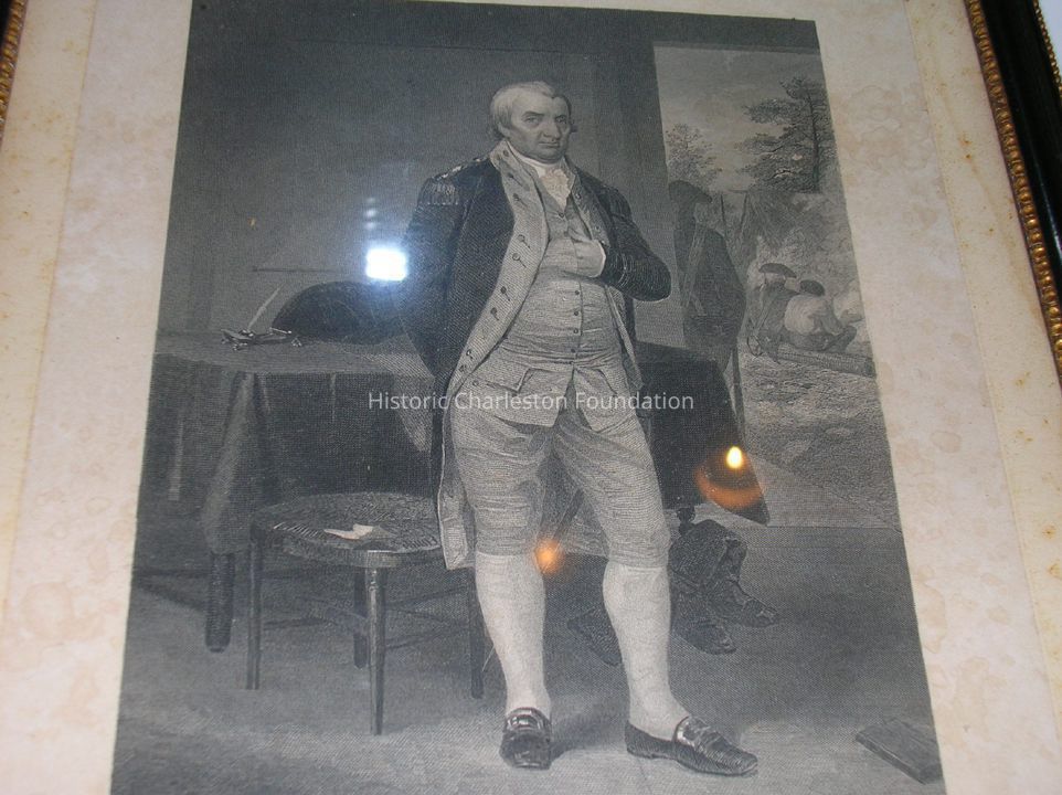 Engraving on paper of Charles Cotesworth Pinckney, Portrait of a military man in an interior setting, standing in front of a table, his rt. hand is behind him, his left hand is tucked into his waiscoat. His military hat is on the table. Seen in an exterior setting are three men, two in uniform, with their backs to the viewer.