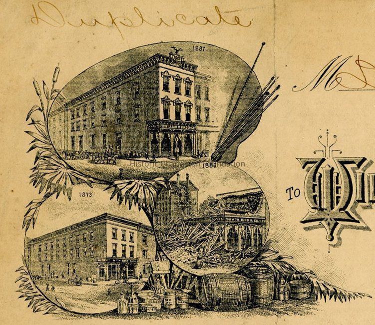 Engraving on a William M. Bird & Co. invoice. Features three views of the building at 205 East Bay Street: 1873, 1886 (after the earthquake), and 1887.Collection