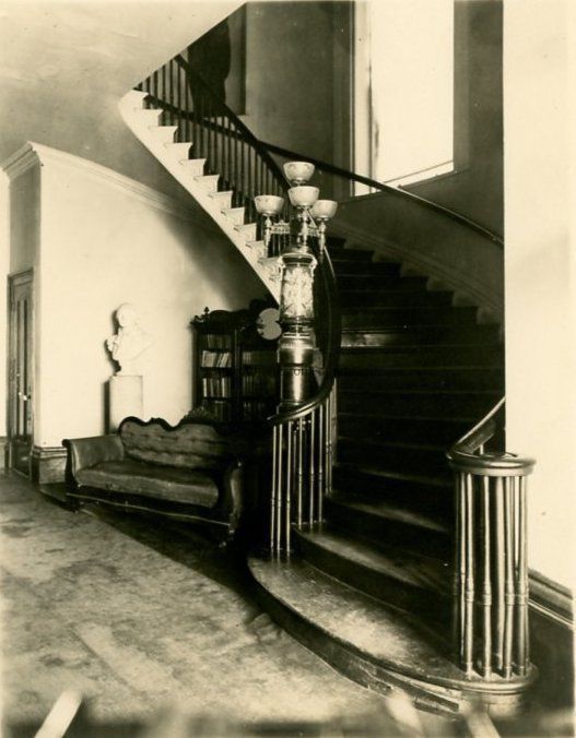 B&W photograph of the entry hall of the Robert William Roper House featuring the foot of the staircase.Photograph Details