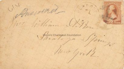 Two envelopes addressed to Mrs. William Aiken in Saratoga Springs, New York. Presumably, they contained the two letters from Henrietta Aiken Rhett, Object ID Nos. 2005.014.001-002. Fronts of both are post-marked Flat Rock, N.C., and each have 2 cent stamps. Postmark date is faint but appears to be 1884. Back of one is stamped with a circular stamp "Saratoga Springs Jul 23 8 A.M. Recd" and back of the other is stamped with a circular stamp "Saratoga Springs Jul 26 8 A.M. Recd." Both have "Answered" handwritten on front.Collection