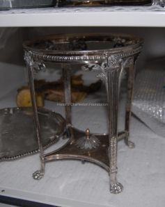Epergne, Sheffield, early 19th century, having everted leaf rim above tapered vase-shaped standard haivng vertical acanthus leaf lower area of body, fitted with four leaf-capped and shaped arms terminating with circular dish holders, onlcircular shaped pedestal base, having four shell-shaped and scroll feet with floral, 'C'-scroll and leaf border decoration; each arm numbered and marked with number one through four, engraved with machine number 2777.K, each arm fitted with cut glass, circular bowl having sawtooth cut and scallped edge with leaf-shaped body and star design bottom center. Stamped on bottom with hallmarkes of T. & J. Creswick, Sheffield, 1811, scratched with number 2777.KCollection