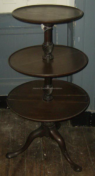 Dumbwaiter, English, late 18th century, mahogany, having three graduated dish-shaped tiers, turned urn-shaped standard, on three cabriole legs and pad feet raised on castersCollection