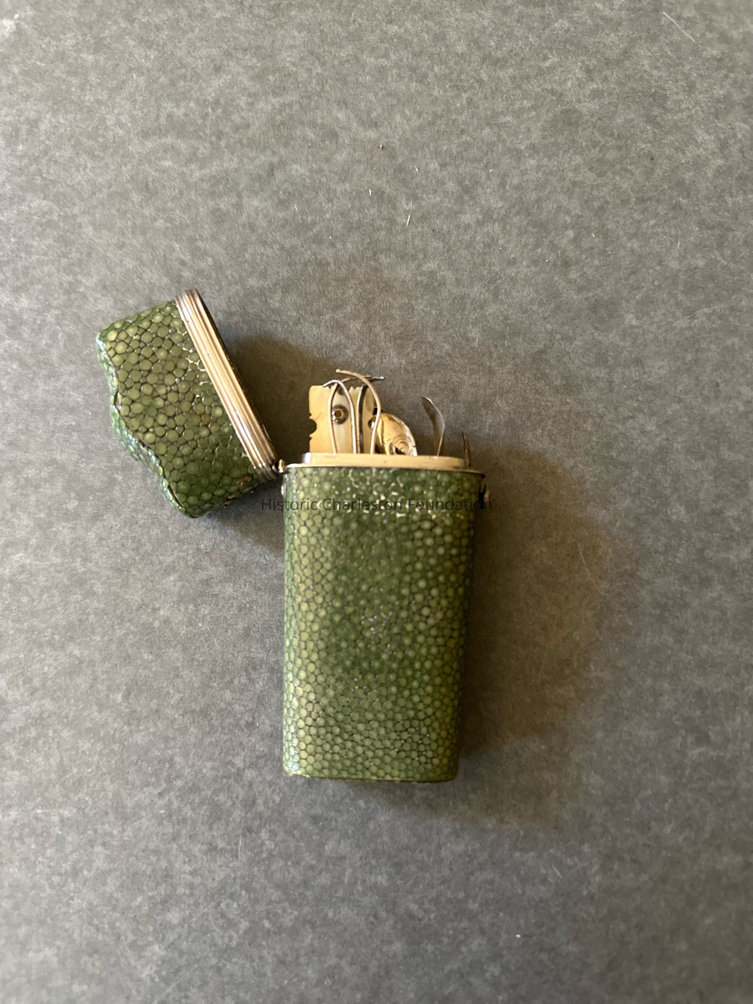 A small metal box with hinged flip top, covered in green shark skin (shagreen) and fitted on the inside to accommodate tools for personal grooming. Small size suggests it may have been used when traveling or carried in a lady's pocket. Tools are, front to back: