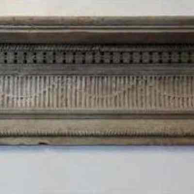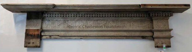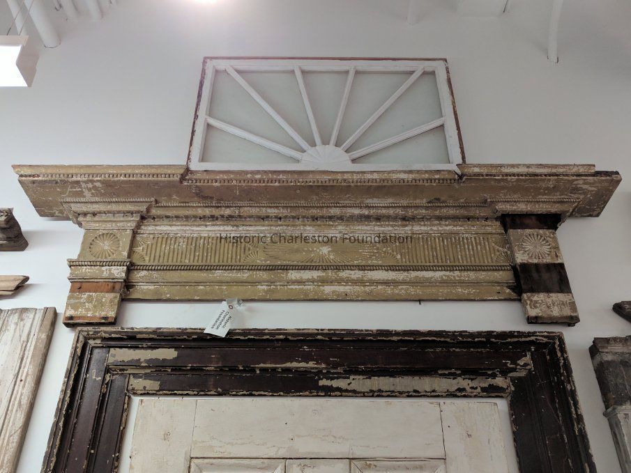 Features carved vertical designs and oval spiderwebbed rosettes on the trusses, with rope molding around the bottom and top of the entablature. The denticulated molding at the top is filled in with small circles in each opening.