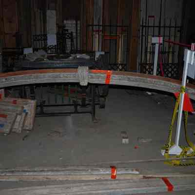 Wood and compo archway from the Judge Mitchell King House. Compo appliques include spiraling vine-like motifs. Underside of the arch is made of four curved wooden panels separated by rails.