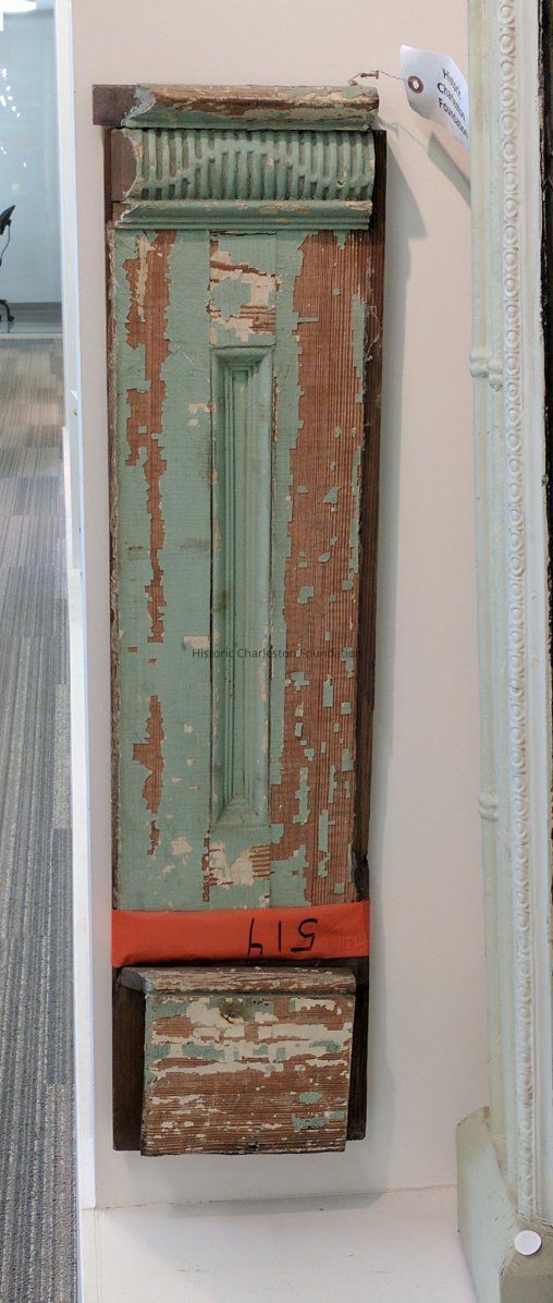 Dado panel with blue and green paint. Has interesting carved detail along the top edge of the item made of vertical reeding and a wave-like design running through the reeding.