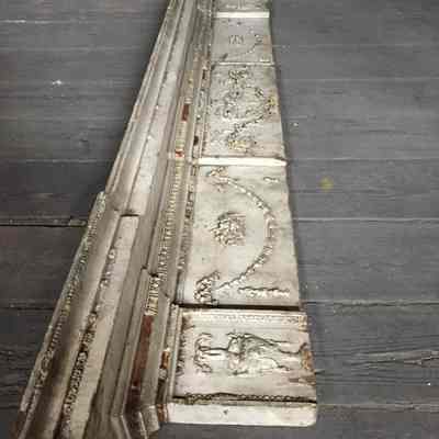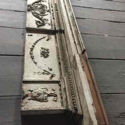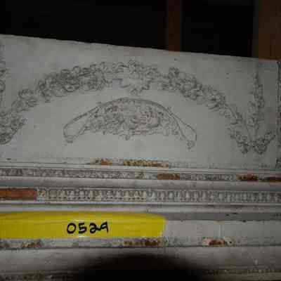Pediment (or mantelpiece). Federal, 1805-1815. Painted light gray, with compo swags and decoration and wooden trim detail. Areas of missing wooden detail; dirty; missing some of the swag, trim, and paint. From Belvidere Plantation.Collection