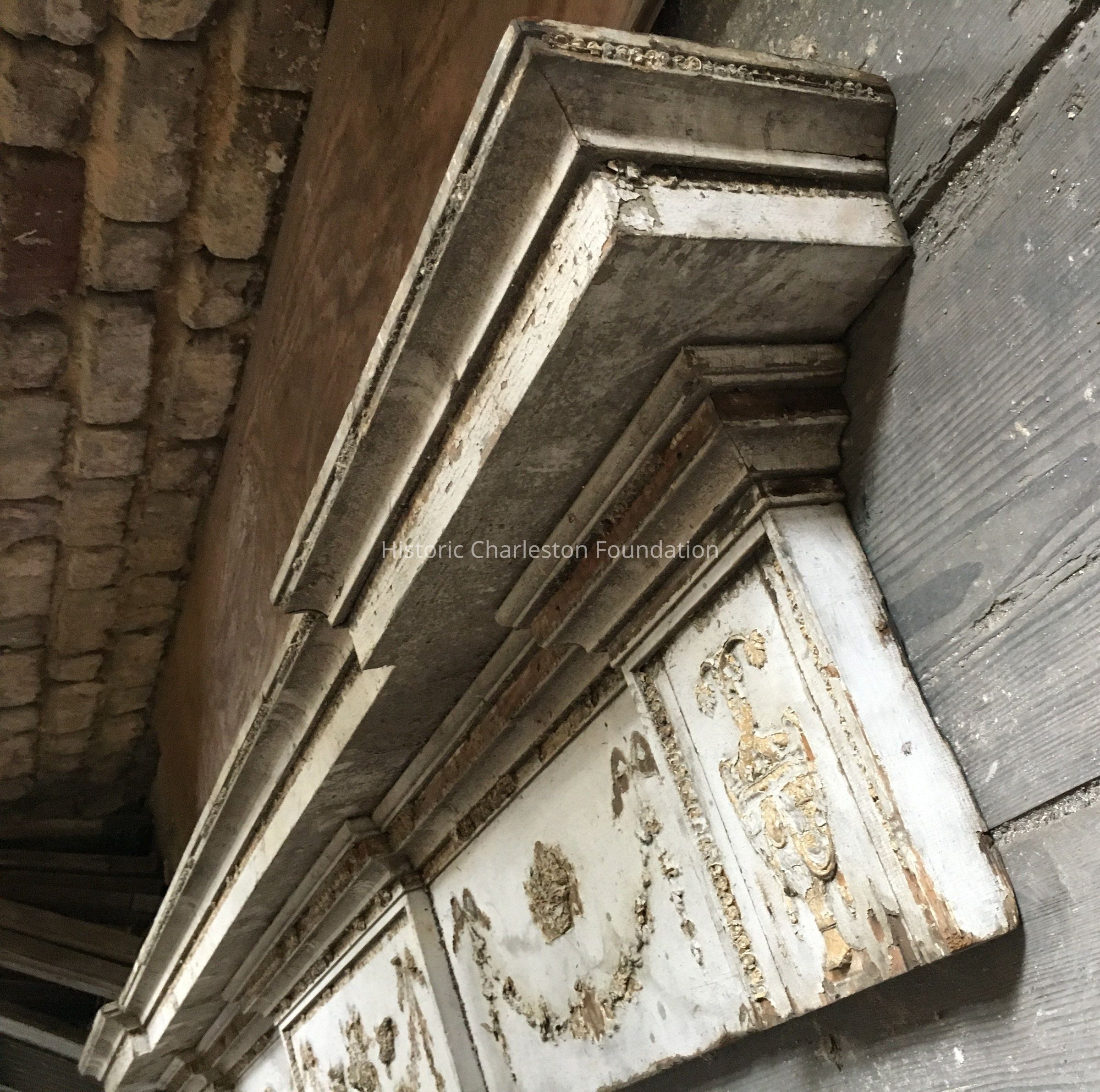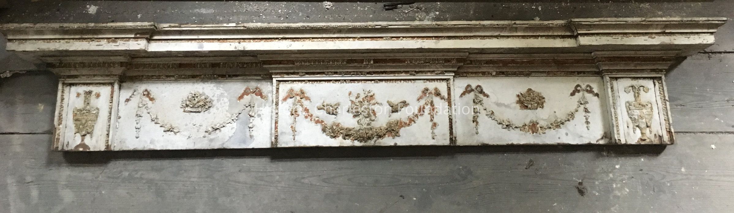 Pediment (or mantelpiece). Federal, 1805-1815. Painted light gray, with compo swags and decoration and wooden trim detail. Areas of missing wooden detail; dirty; missing some of the swag, trim, and paint. From Belvidere Plantation.Collection