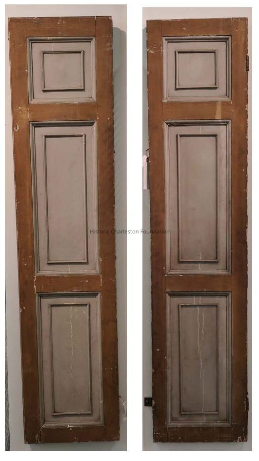 Pair of Federal three-panel wooden shutters, with sunken panels and applied astragal molding. Two-color paint scheme with blue-gray and brown survives. Contains two sets of hinges.