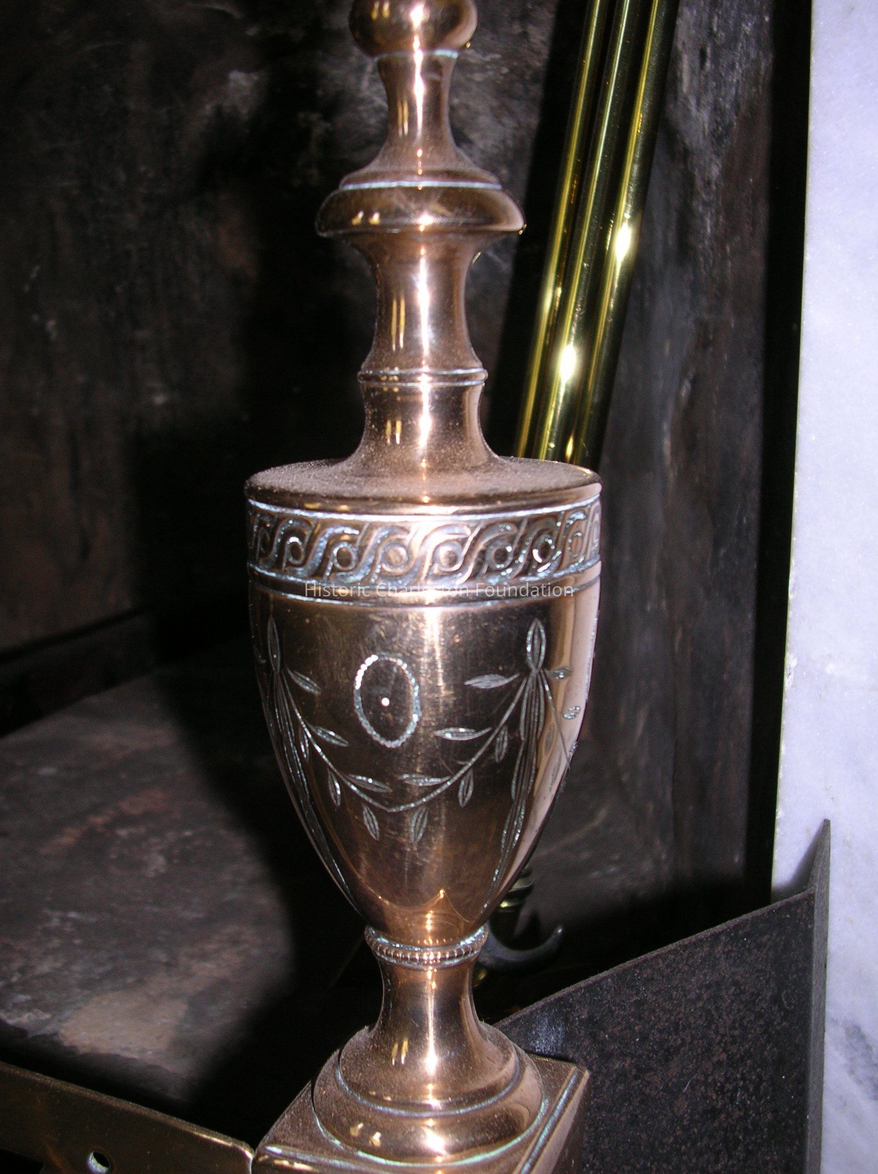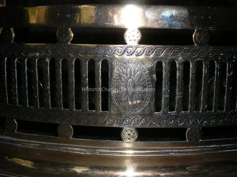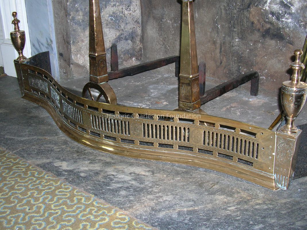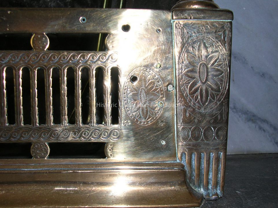 Brass Serpentine Fender, English For the Charleston Markedt, C.1785. with Two Finials Engraved with Swags and Guilloche. Patera, Vines and Ovals Adorn the Corner Finial Supports and the Body Bears a Polished Patera and GuillocheCollection