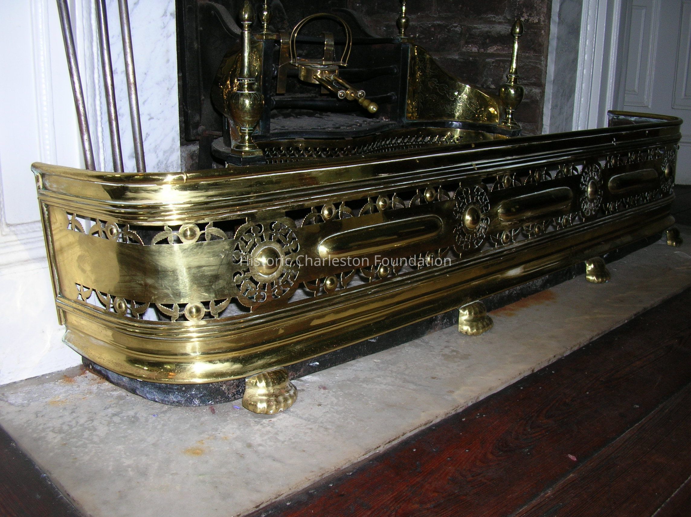 Fender, reticulated "D" shaped fireplace fender has a central frieze punctuated with a series of pierced roundels that are interrupted with raised horizontal lozenges. It stands on six modified paw feet.Context