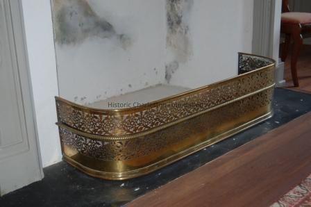 Fender, brass with D-shaped body, top having rolled rail above pierced body decoration of circlar floral, thistle and leaf pattern over rope center band, above conforming pierced design, over flat molded base, feet missing.Collection