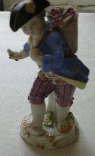 Figure of young boy, carrying grape cutter with basket on back, wearing blue coat. Stamped on underside crossed swords, impressed #8/127V, 'Germany' #36Collection