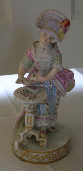 Figure of a woman, plaing cards. Continental, 20th century. She is wearing a hat with yellow ribbon and plumes, pink overdress caught up at back, foot resting on leg of circular table fitted with playing cards. Impressed on underside with crossed swords F 64 and #17Collection
