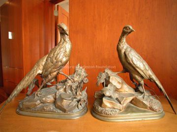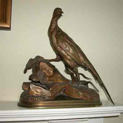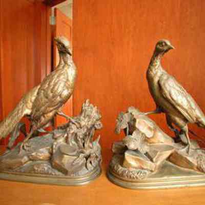 Pair bronze pheasants, male and female, each on oval base; male standing on rock and tree stump formation with figure of otter, signed lower left J. Moigniez; female figure on oval base having rock and leaf formation, signed lower right J. Moigniez.Collection