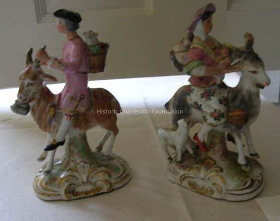 One of Pair of figures, Continental, 20th century, depicting tailor and his wife, tailor is on goat's back, carrying satchel in mouth; the wife and family on other goat figure with baby goat walking next to mother, female figure is carrying baby in arms with two other babies in basket on back; both on oval bases with gold scroll decoration. 'Made in France' handpainted on underside with crossed quills, paper label reads 'Porcelain of Paris' #10763Collection
