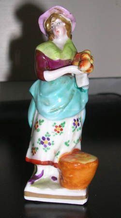3 Figures, Samson, late 19th century, consisting of two males and one female; onei s apple vendor with a basket of apples and wearing a green jacket; other is flower vendor in blue jacket with basket of flowers and bouquet in his hand; female holding burnt orange and floral bouquet of flowers with basket at her feet on rectangular plinth. Marked on underside are red numbers 1 5 6 9, backside of each figure painted with gold anchor, one retains paper sticker handwritten 'Made in France'Collection