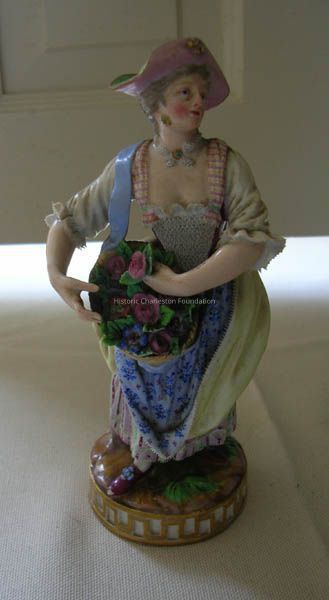 One of a pair figures, after 19th century. Meissen, female, holding baskets of flowers, on base having Greek key design. Female marked 72,Collection