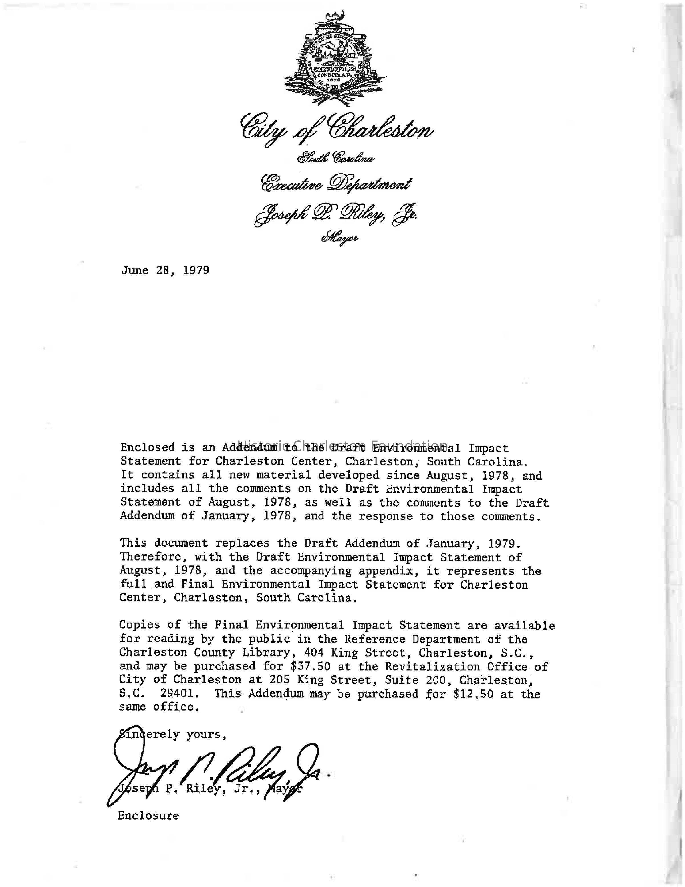 From enclosure letter from Mayor Riley (see Media tab): "Contains new material developed since August, 1978, and includes all the comments on the Draft Environmental Impact Statement of August, 1978, as well as the comments to the Draft Addendum of January, 1978, and the response to those comments. This document replaces the Draft Addendum of January, 1979. Therefore, with the Draft Environmental Impact Statement of August, 1978, and the accompanying appendix, it represents the full and Final Environmental Impact Statement for Charleston Center."Created By