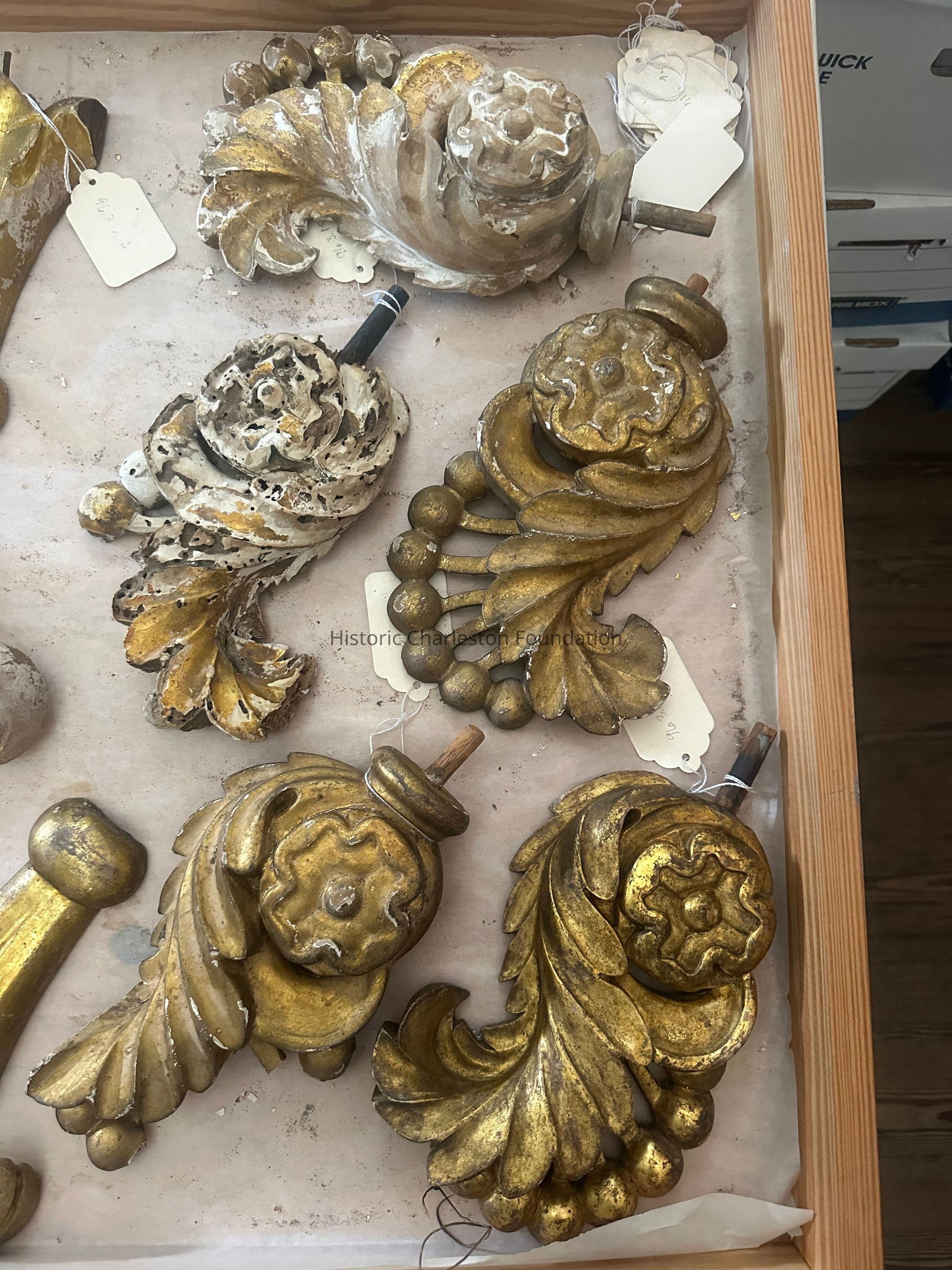 Carved wooden finials shaped like floral medallions with foliage and pistols of a flower,gild on red ground. Used as curtain decoration.