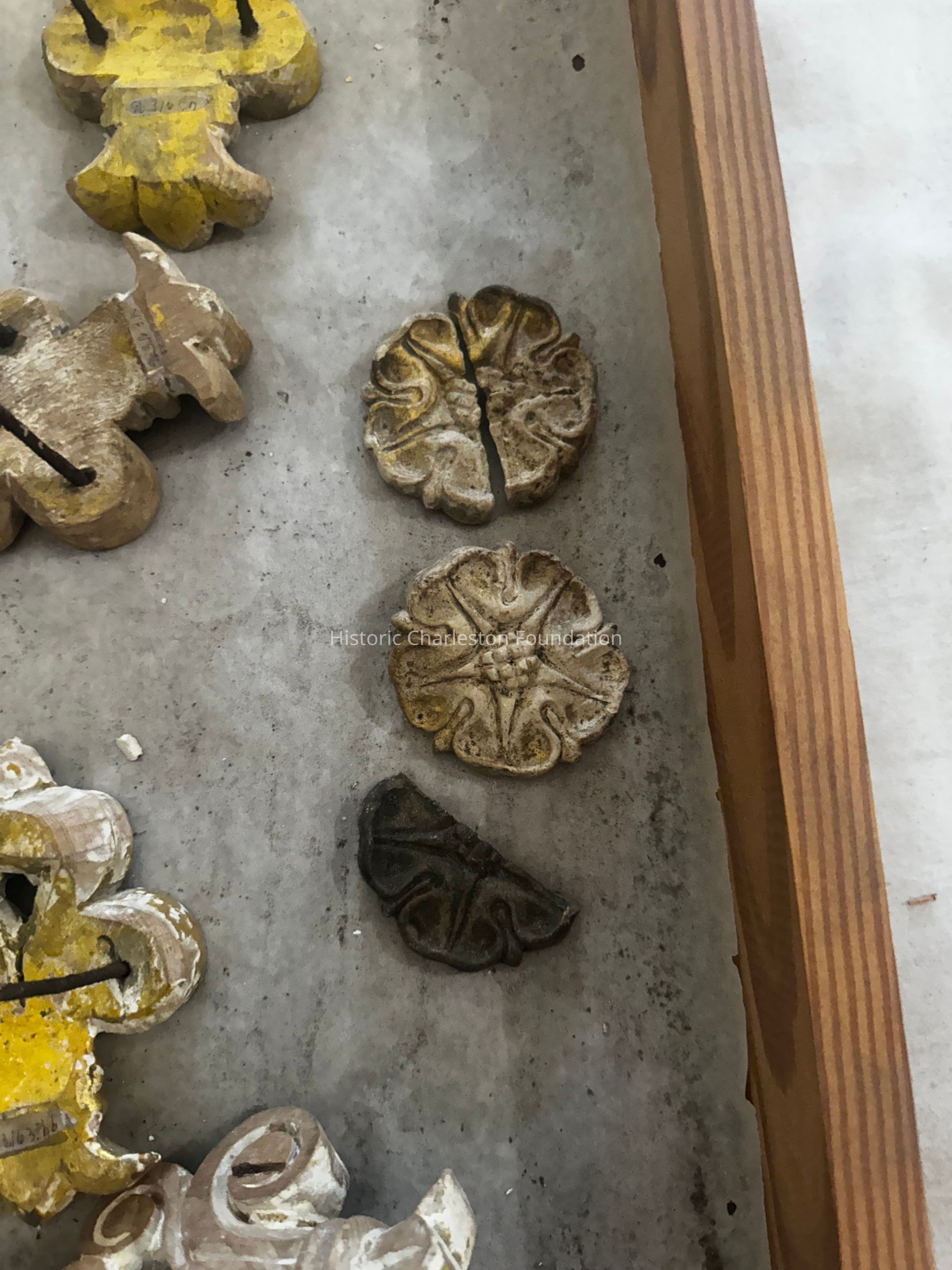 Carved wooden medallions in gild on red ground used as curtain decoration. In Tray two.