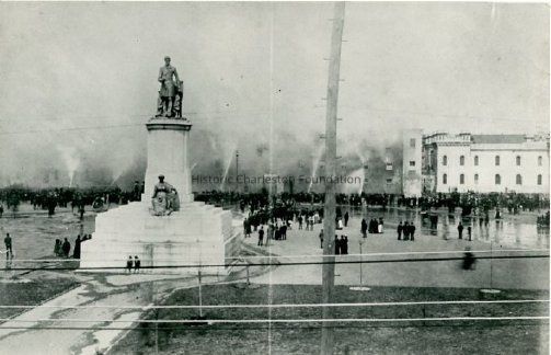 B&W photograph of a fire being fought at the Citadel on March 14, 1892, viewed from the parade grounds/public mall on the grounds of the Old Citadel, now known as Marion Square. The Calhoun Monument is in the foreground and crowds are gathered on the grounds.Context