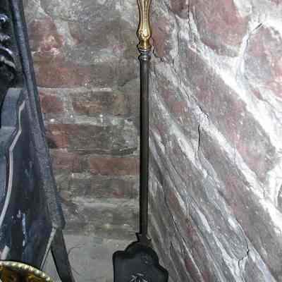 Each piece with cast brass finials in roccoco taste having leaf decoration, shovel has pierced design within an oval shape at baseCollection